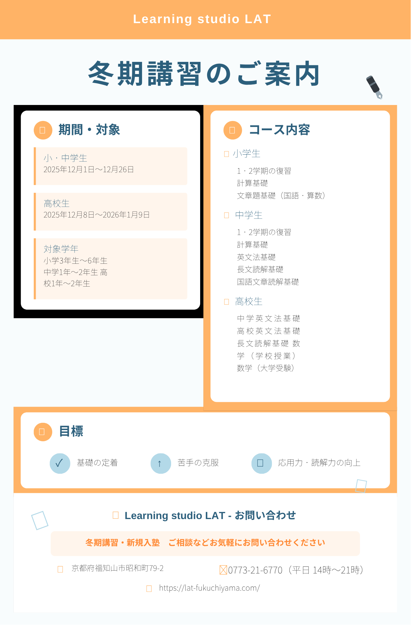 次学年へ向けて1.2学期の復習がしたい。受験や中学生に上がる前に基礎を定着させたいなど勉強に不安を抱えている人はLearning studio LATまでお気軽にご相談ください。
